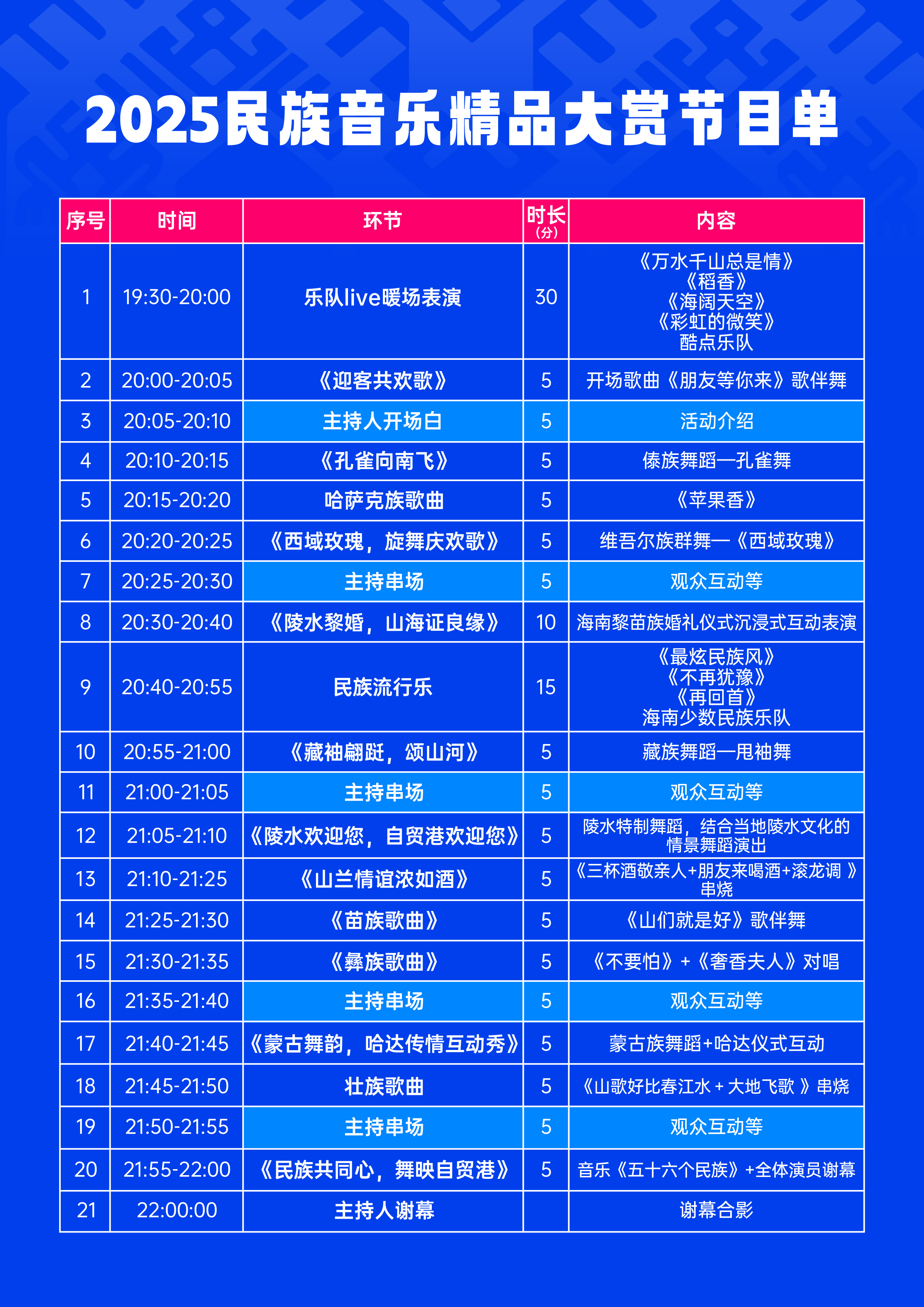 当自贸港的夜幕为陵水披上星光,一场夜间文化盛宴正浓墨酝酿。11月14日至15日每晚19:00起,陵水海航体育场将开启2025民族音乐精品大赏,民族歌舞的灵动、本地疍家渔歌的悠扬与城市数字光影碰撞出独特火花,无论是本地居民还是外地来客,都能在这场夜色里的狂欢中找到专属乐趣。